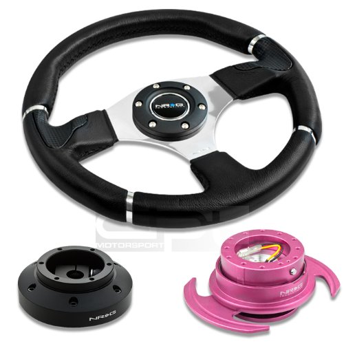 NRG-SRK-101H+008R+650PK, NRG Innovations 13.78" 350mm Black Leather Racing Steering Wheel Combo with 6 Hole Short Hub Adapter with Gen 3.0 with Handle Pink Quick Release Kit SRK-101H ![]()